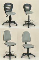 Pneumatisch höhenverstellbarer (64–77 cm) Hocker mit kurzer Lehne,Fußring und Rollen. (ohne Abbildung)